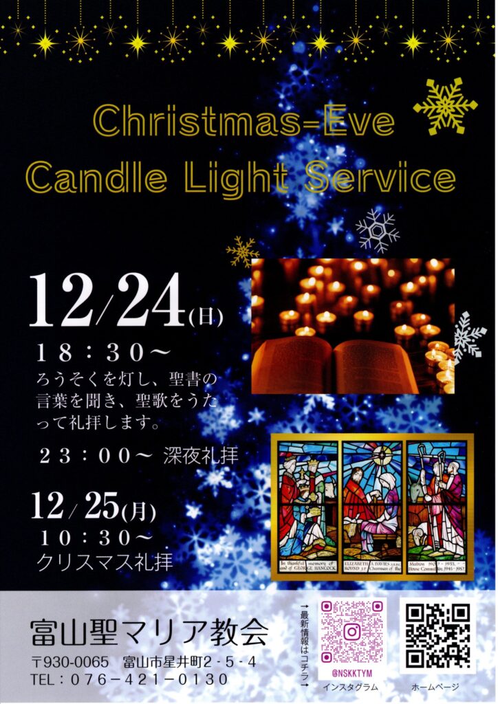 ニュース/ 礼拝案内 クリスマス礼拝のご案内 2023-12-07 12月24日 イブ礼拝18:30~20:00頃 深夜礼拝23:00~23:45 12月25日 降誕日聖餐式(クリスマス礼拝)10:30~11:30