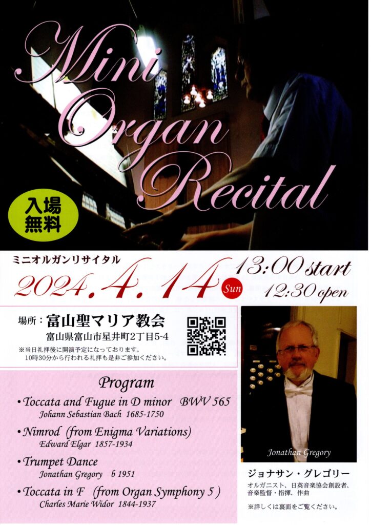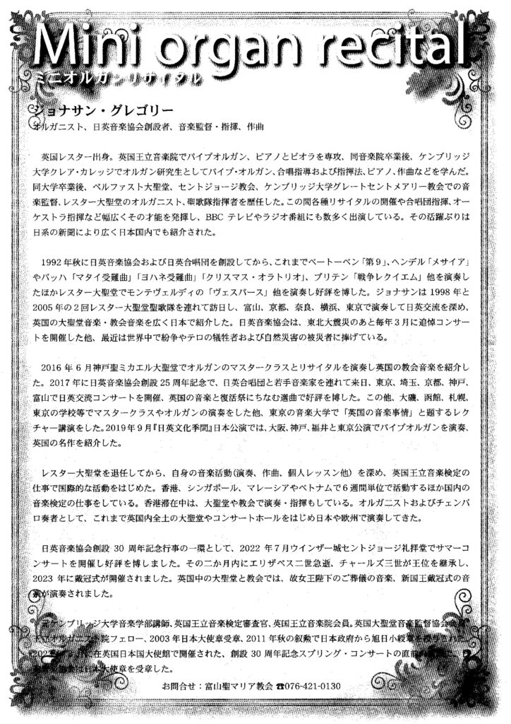 ニュース ミニ・オルガンリサイタル 2024-03-17 4月14日(日)礼拝後ジョナサン・グレゴリー氏によるミニ・オルガンリサイタルが行われます。 ジョナサン氏は当日の礼拝の奏楽も担当してくださる予定です。ご期待ください。